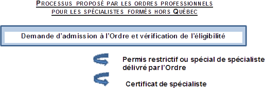 - Rencontre de l’Ordre des dentistes du Québec et l’Ordre des médecins vétérinaires du Québec avec l’Office des professions du Québec le 5 juin 2014 afin de demander à l’Office de régler le problème rapidement et de faire tomber la barrière à la mobilité professionnelle des spécialistes formés hors Québec;