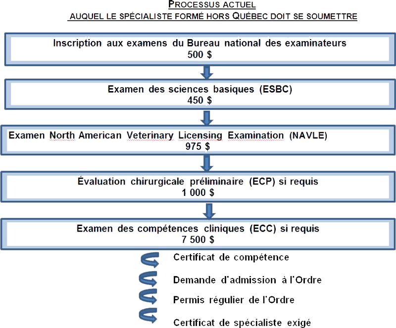 « Actuellement, les règles imposées par le Code des professions empêchent notre ordre professionnel de délivrer un permis de spécialiste et un certificat de spécialiste à un médecin vétérinaire spécialisé formé hors Québec, et ce, même si ses compétences et ses connaissances ont été certifiées par un organisme reconnu, soit un collège de spécialité américain. Le candidat est ainsi tenu de réussir plusieurs examens nationaux de médecine vétérinaire générale alors qu’il ne souhaite pratiquer que dans sa spécialité. Pourtant, il serait nettement plus simple de lui délivrer un permis spécial et un certificat de spécialiste lui permettant de pratiquer sa spécialité plutôt que de lui imposer des examens dans tous les domaines de pratique. On freine inutilement la mobilité des professionnels et leur intégration aux établissements du Québec », a déclaré le président de l’Ordre des médecins vétérinaires du Québec, le Dr Joël Bergeron.