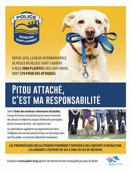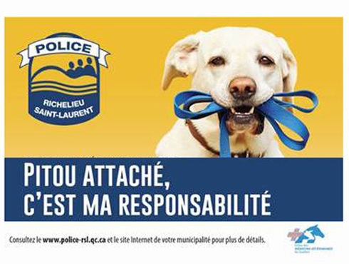 Depuis 2010, la Régie intermunicipale de police Richelieu-St-Laurent a reçu 3 000 plaintes liées aux chiens dont 270 pour des attaques. La campagne Pitou attaché, c'est ma responsabilité vise à sensibiliser les propriétaires de chiens à l'importance de tenir leur chien en laisse en tout temps. Les propriétaires récalcitrants s'exposent à des constats d'infraction et éventuellement à des amendes. Plus de détails au www.police-rsl.qc.ca.