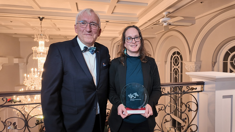 Photo : Dr Gaston Rioux, président de l'Ordre et Dre Marie Noël, lors de la remise au congrès 2022 de l'AMVPQ. Crédit photo : AMVPQ